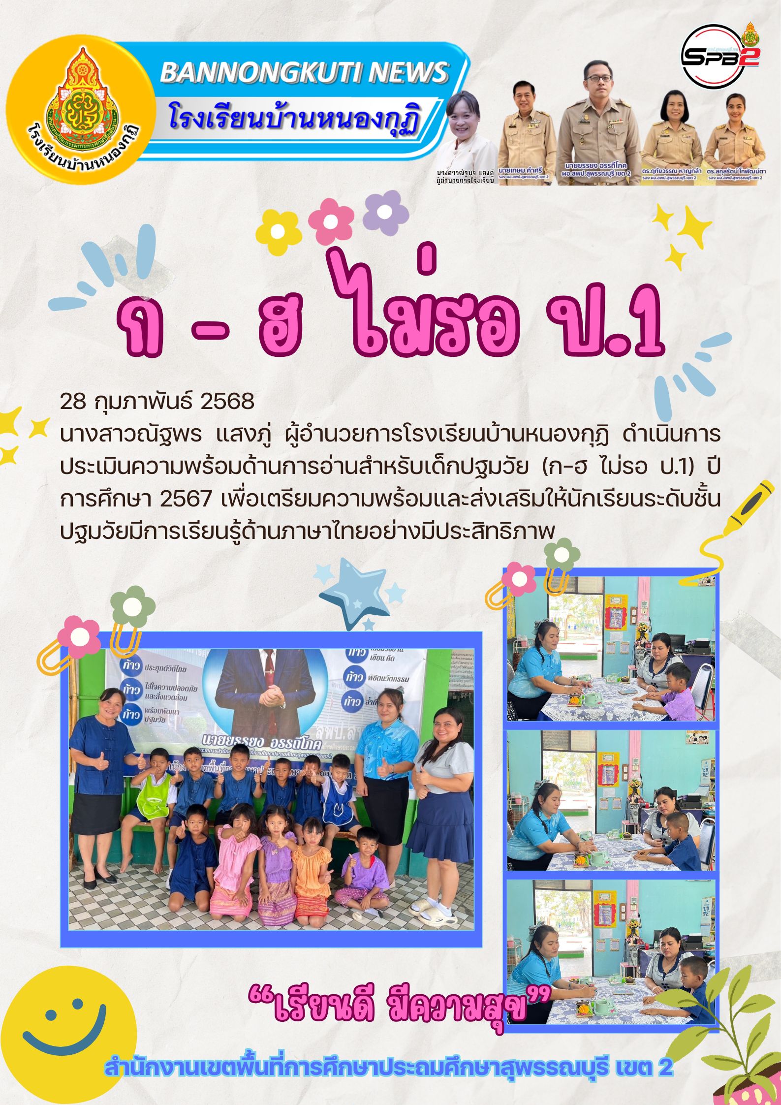 วันที่ 28 กุมภาพันธ์ 2568 นางสาวณัฐพร แสงภู่ ผู้อำนวยการโรงเรียนบ้านหนองกุฏิ ดำเนินการประเมินความพร้อมด้านการอ่านสำหรับเด็กปฐมวัย (ก-ฮ ไม่รอ ป.1) ปีการศึกษา 2567 เพื่อเตรียมความพร้อมและส่งเสริมให้นักเรียนระดับชั้นปฐมวัยมีการเรียนรู้ด้านภาษาไทยอย่างมีประสิทธิภาพ