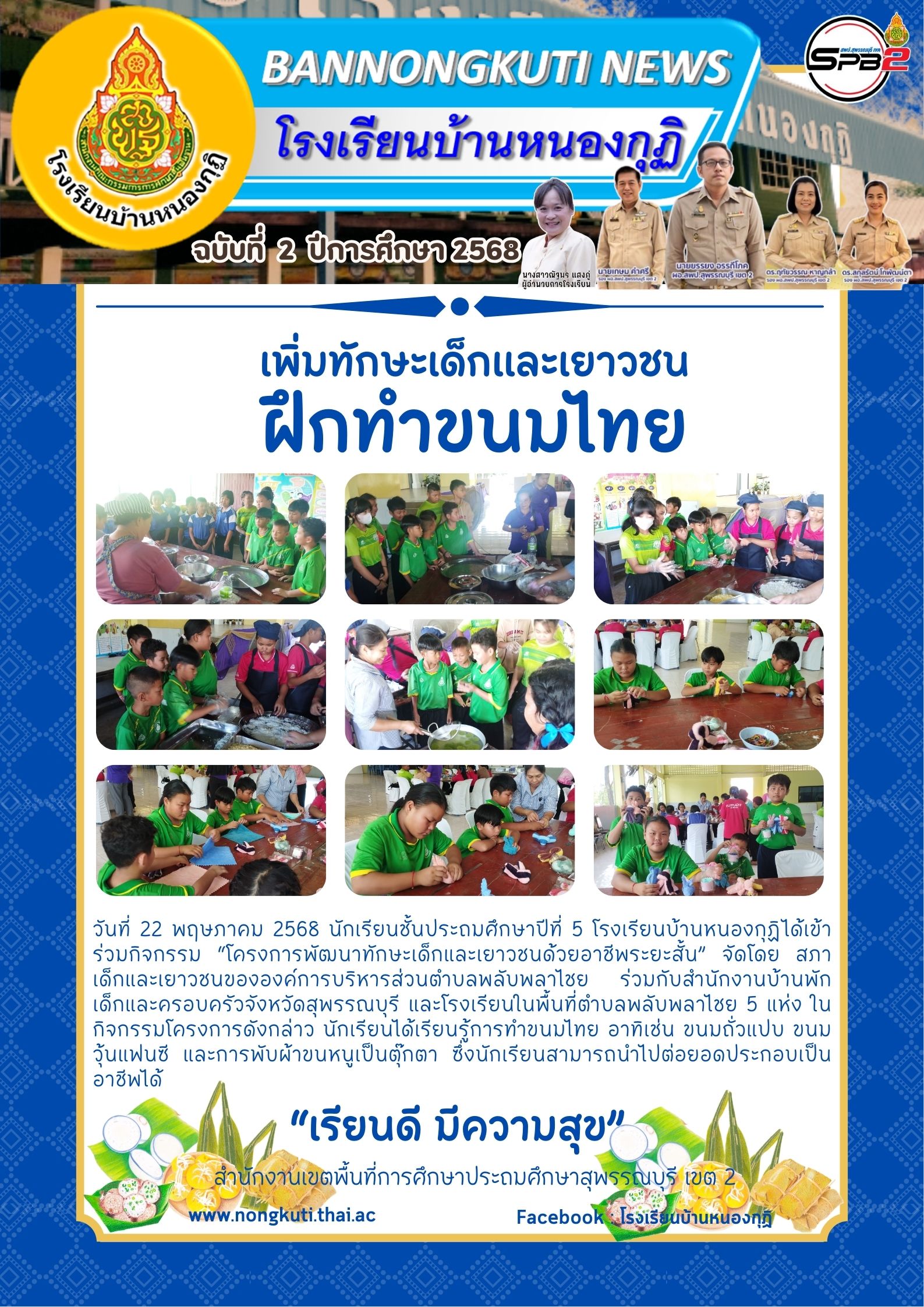 วันที่ 22 พฤษภาคม 2568 นักเรียนชั้นประถมศึกษาปีที่ 5 โรงเรียนบ้านหนองกุฏิได้เข้าร่วมกิจกรรม “โครงการพัฒนาทักษะเด็กและเยาวชนด้วยอาชีพระยะสั้น” จัดโดย สภาเด็กและเยาวชนขององค์การบริหารส่วนตำบลพลับพลาไชย ร่วมกับสำนักงานบ้านพักเด็กและครอบครัวจังหวัดสุพรรณบุรี และโรงเรียนในพื้นที่ตำบลพลับพลาไชย 5 แห่ง ในกิจกรรมโครงการดังกล่าว นักเรียนได้เรียนรู้การทำขนมไทย อาทิเช่น ขนมถั่วแปบ ขนมวุ้นแฟนซี และการพับผ้าขนหนูเป็นตุ๊กตา ซึ่งนักเรียนสามารถนำไปต่อยอดประกอบเป็นอาชีพได้