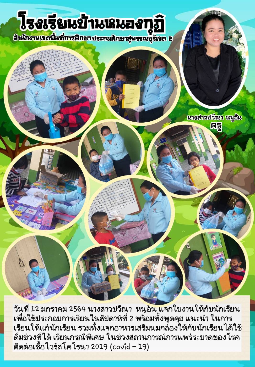 คุณครูปวีณา หนูอ้น ครูประจำชั้นประถมศึกษาปีที่ ๑ แจกใบงานและนมกล่อง ในช่วงสถานการณ์ COVID-19