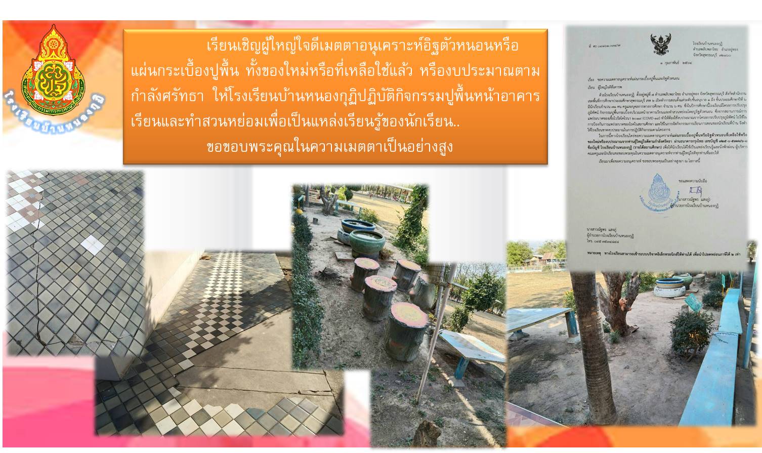 เรียนเชิญผู้ใหญ่ใจดีเมตตาอนุเคราะห์อิฐตัวหนอนหรือแผ่นกระเบื้องปูพื้น ทั้งของใหม่หรือของที่เหลือใช้แล้ว หรืองบประมาณตามกำลังศรัทธา ให้โรงเรียนบ้านหนองกุฏิทำกิจกรรมปูพื้นหน้าอาคารเรียนและทำสวนหย่อมเพื่อเป็นแหล่งเรียนรู้ของนักเรียน .......ขอขอบพระคุณในความเมตตาเป็นอย่างสูง