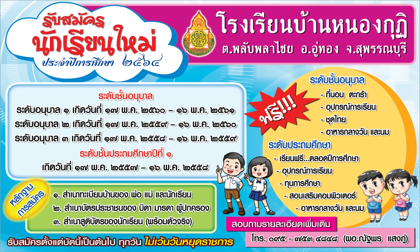 โรงเรียนบ้านหนองกุฏิ ประกาศรับสม้ครนักเรียนใหม่ ประจำปีการศึกษา 2564  ชั้นอนุบาล 1-3  และชั้นประถมศึกษาปีที่ 1 ผู้ปกครองสามารถติดต่อสอบถามโดยตรงได้ที่โรงเรียนบ้านหนองกุฏิ  หรือ ติดต่อ ผอ.ณัฐพร  แสงภู่   โทร  095 753 4848