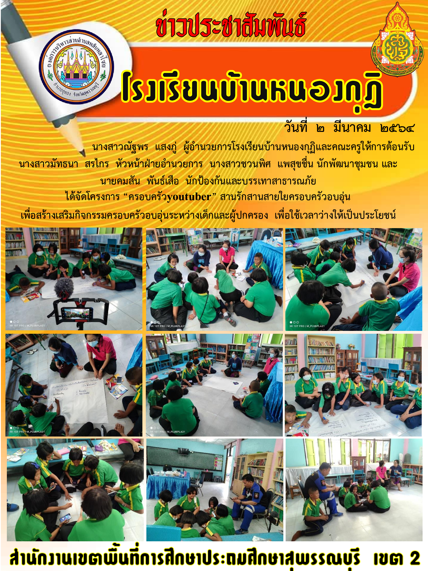 นางสาวณัฐพร แสงภู่ ผู้อำนวยการโรงเรียนบ้านหนองกุฏิ ได้ให้การต้อนรับ นางสาวมัทธนา ศรไกร หัวหน้าฝ่ายอำนวยการ นางสาวชวนพิศ แพสุขชื่น นักพัฒนาชุมชน และนายคมสัน พันธ์ุเสือ นักป้องกันและบรรเทาสาธารณภัย ได้จัดโครงการ "ครอบครัว Youtuber" สานรักสานสายใยครอบครัวอบอุ่น เพื่อสร้างเสริมกิจกรรมครอบครัวอบอุ่นระหว่างเด็กและผู้ปกครอง เพื่อใช้เวลาว่างให้เป็นประโยชน์