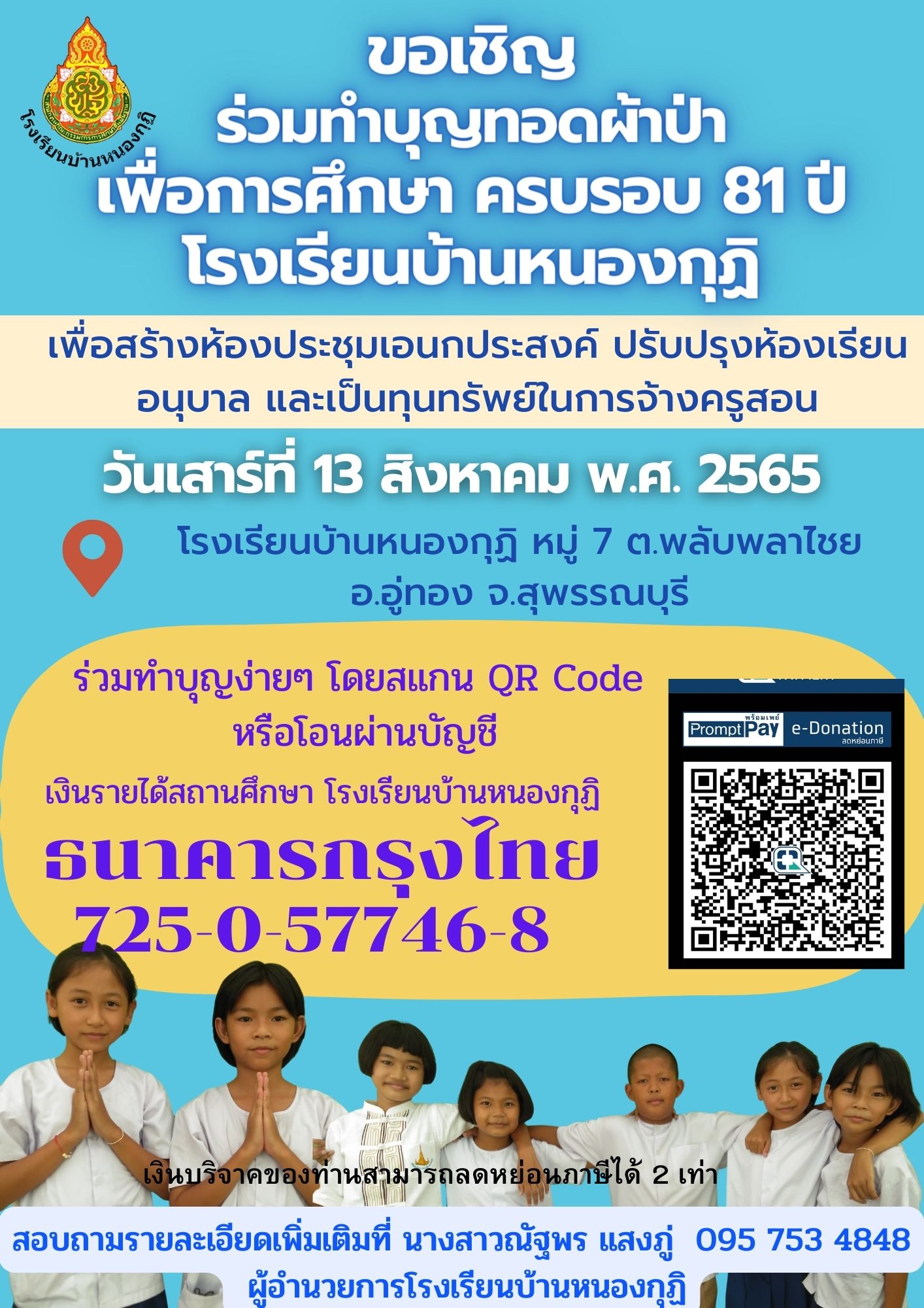 ขอเชิญร่วมทำบุญทอดผ้าป่าเพื่อการศึกษา ครบรอบ 81 ปี โรงเรียนบ้านหนองกุฏิ