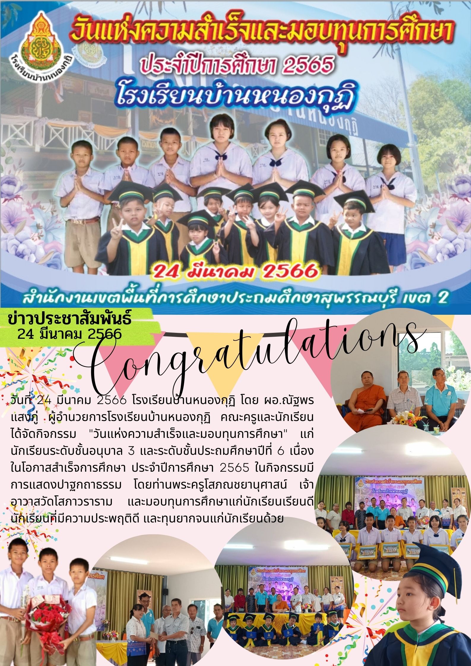 24 มีนาคม 2566 โรงเรียนบ้านหนองกุฏิ โดย ผอ.ณัฐพร แสงภู่ ผู้อำนวยการโรงเรียนบ้านหนองกุฏิ คณะครู คณะกรรมการสถานศึกษา นักเรียนและผู้ปกครอง ได้ร่วมจัดกิจกรรม "วันแห่งความสำเร็จและมอบทุนการศึกษา" แก่นักเรียนที่สำเร็จการศึกษาระดับชั้นอนุบาล 3 และ ชั้นประถมศึกษาปีที่ 6 ทั้งนี้ โรงเรียนบ้านหนองกุฏิได้รับความอนุเคราะห์จากท่านพระครูโสภณชยานุศาสน์ เจ้าอาวาสวัดโสภาวราราม ได้เมตตาแสดงปาฐกถาธรรม และมอบเกียรติบัตรแก่นักเรียนที่สำเร็จการศึกษา