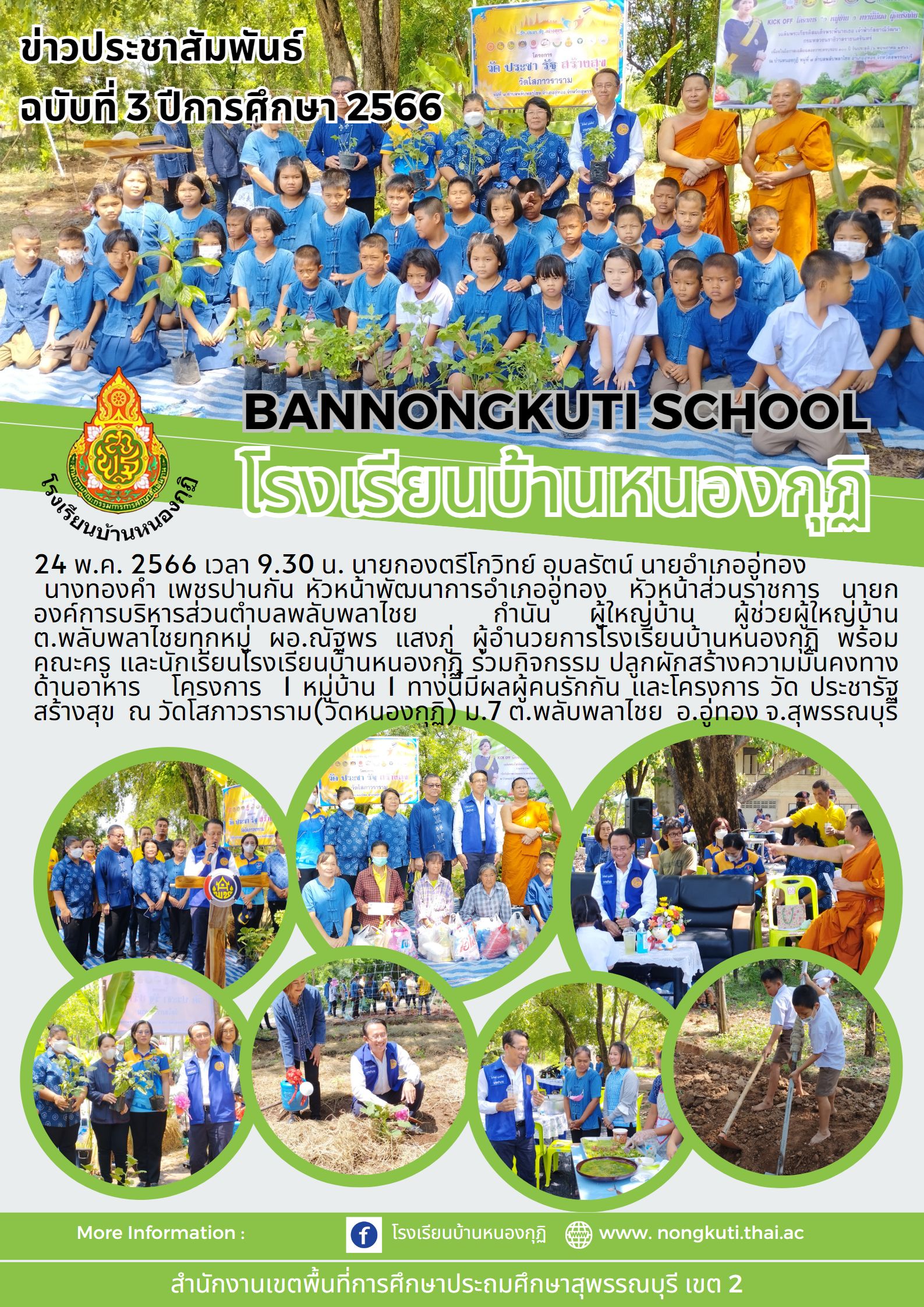 24 พ.ค. 2566 เวลา 9.30 น. นายกองตรีโกวิทย์ อุบลรัตน์ นายอำเภออู่ทอง นางทองคำ เพชรปานกัน หัวหน้าพัฒนาการอำเภออู่ทอง หัวหน้าส่วนราชการ นายกฯ พีระศักดิ์ มาตรศรี นายกองค์การบริหารส่วนตำบลพลับพลาไชย กำนัน ผู้ใหญ่บ้าน ผู้ช่วยผู้ใหญ่บ้านต.พลับพลาไชยทุกหมู่ ผอ.ณัฐพร แสงภู่ ผู้อำนวยการโรงเรียนบ้านหนองกุฏิ พร้อมคณะครู และนักเรียน ร่วมกิจกรรม ปลูกผักสร้างความมั่นคงทางด้านอาหาร โครงการ 1 หมู่บ้าน 1 ทางนี้มีผล ผู้คนรักกัน และโครงการประชารัฐ วัด ประชารัฐ สร้างสุข ณ วัดโสภาวราราม(วัดหนองกุฏิ) ม.7 ต.พลับพลาไชย อ.อู่ทอง จ.สุพรรณบุรี