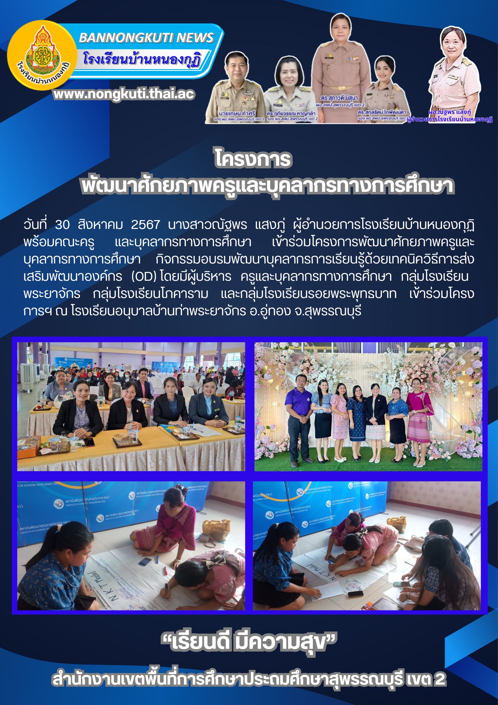 วันที่ 30 สิงหาคม 2567 นางสาวณัฐพร แสงภู่ ผู้อำนวยการโรงเรียนบ้านหนองกุฏิ พร้อมคณะครูและบุคลากรทางการศึกษา เข้าร่วมอโครงการพัฒนาศักยภาพครูและบุคลากรทางการศึกษา กิจกรรมอบรมพัฒนาบุคลากรเรียนรู้เรียนรู้ด้วยวิธีการส่งเสริมพัฒนาองค์กร (OD) ณ ห้องประชุมโรงเรียนบ้านท่าพระยาจักร