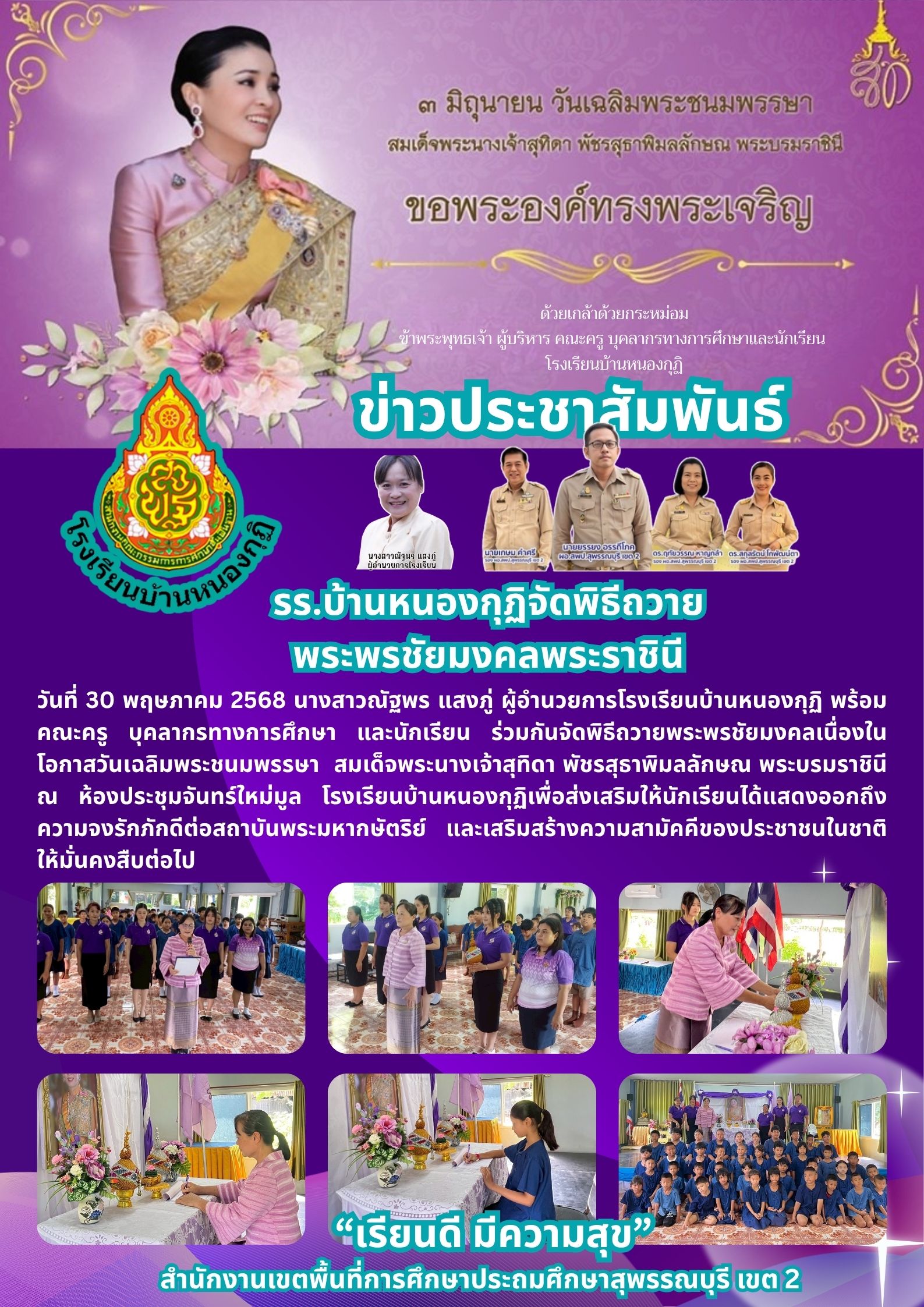 วันที่ 30 พฤษภาคม 2568 โรงเรียนบ้านหนองกุฏิ นำโดย ผอ.ณัฐพร แสงภู่ ผู้อำนวยการโรงเรียน นำคณะครู บุคลากรทางการศึกษา และนักเรียนจัดพิธีถวายพระพรเนื่องในวันเฉลิมพระชนมพรรษาสมเด็จพระนางเจ้าฯพระบรมราชินี ณ ห้องประชุมจันทร์ใหม่มูล โรงเรียนบ้านหนองกุฏิ